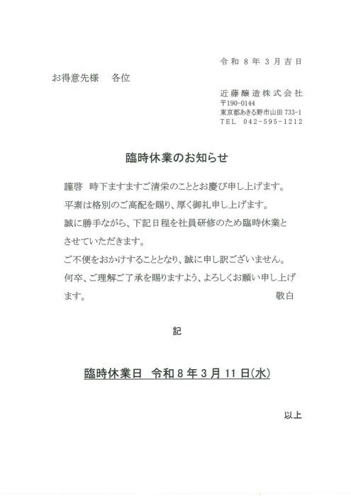 臨時休業のお知らせ 3/11(水)
